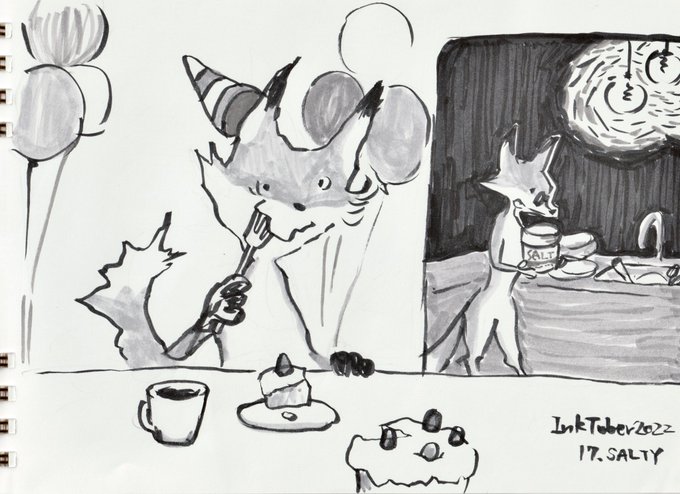 🦊くんと🦊👓ちゃん お誕生日は手作りケーキだったんだって! 17.SALTY This is…an exciting taste…! #inktober #inktober2022 #kuretake_inktober #kuretake_inktober2022 #illustration #illust