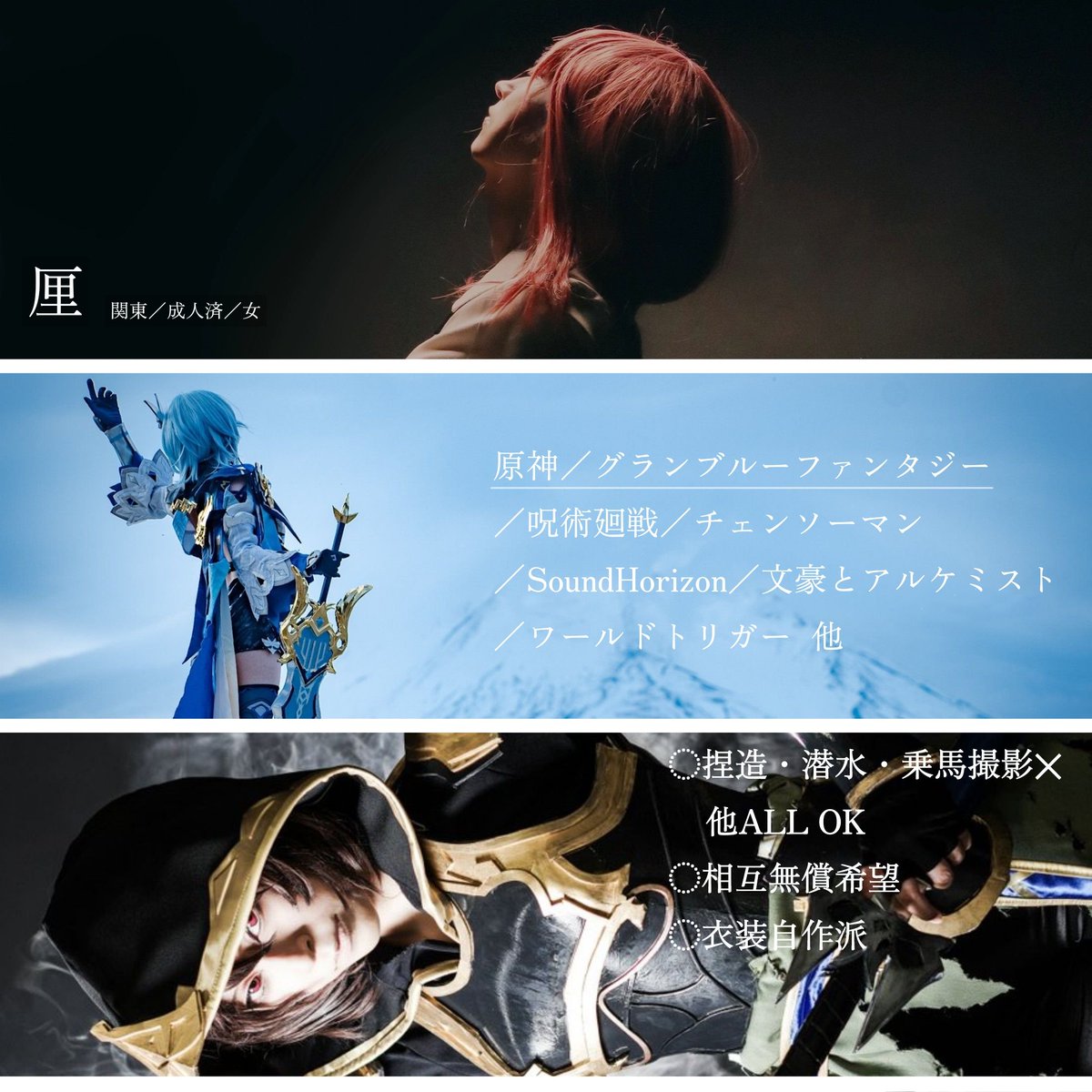 タグ失礼致します! 原神・グラブルをメインにコスしてるオタクです🙌 造形が好きで、いつも何かしら作っています RT♡どちらもお伺いさせて頂きます!ぜひご縁を頂けたら嬉しいです🥰 🔸岩パはいいぞ!🔸 #原神好きさんと繋がりたい #原神レイヤーさんと繋がりたい #相互さんの相互さんと繋がりたい