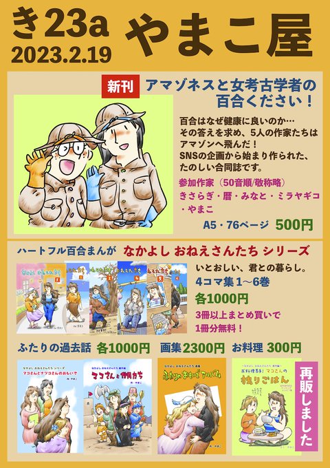 2/19 COMITIA143 参加します! comitia.co.jp 新刊は5名の作家による合同誌「アマゾネスと女考古学者の百合ください!」です。お楽しみに。 「なかよし おねえさんたち」シリーズは「お料理苦手!マコさんの独りごはん」に登場人物紹介を追記して再販しました。 #COMITIA143 #創作百合