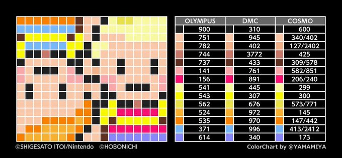 たくさんのいいねやリツイートありがとうございます😭 図案と刺繍糸の色番号をまとめてみましたので、作ってみたい方のお役に立てたら嬉しいです。 ちょっとだけ注意点があるので次のツイートに続きます。 #mother3 #earthbound #クロスステッチ #ドット絵 #crossstitch #dotpict #pixelart twitter.com/yamamiya_jp/st…