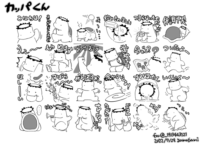 #ヤマサミさんお誕生日だよ2022 3 オリキャラ/カッパ( @_1913443121 ) ちょうどカッパくんラインスタンプでも作ろうかな~と思っていたところなので、せっかくなのでそれ用に描かせていただきました。