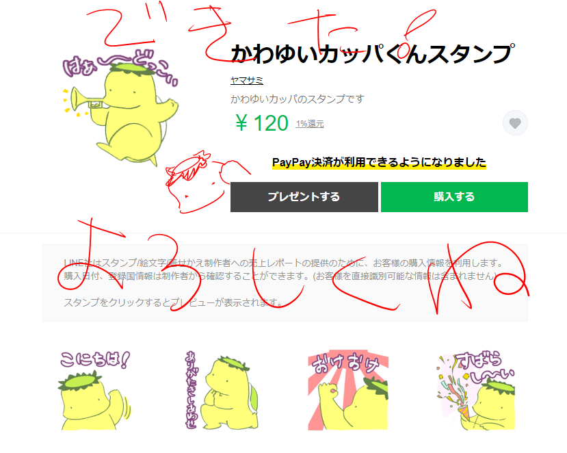 カッパくんのLINEスタンプ(¥120)がついに出ました!全24個のかわゆいカッパくんで君のトークを川流れ!よろしくお願いいたします。 store.line.me/stickershop/pr…