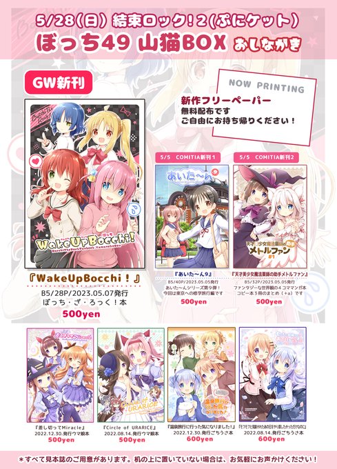 夏コミ新刊のぼざろ本、ごちうさ本、ごちうさ総集編の3種はメロンブックスさまと虎の穴さまで委託をお願いしています! どれも楽しい本になりましたので、どうぞよろしくお願いします✨ 🍈melonbooks.co.jp/circle/index.p…… 🐯ecs.toranoana.jp/tora/ec/cot/ci…