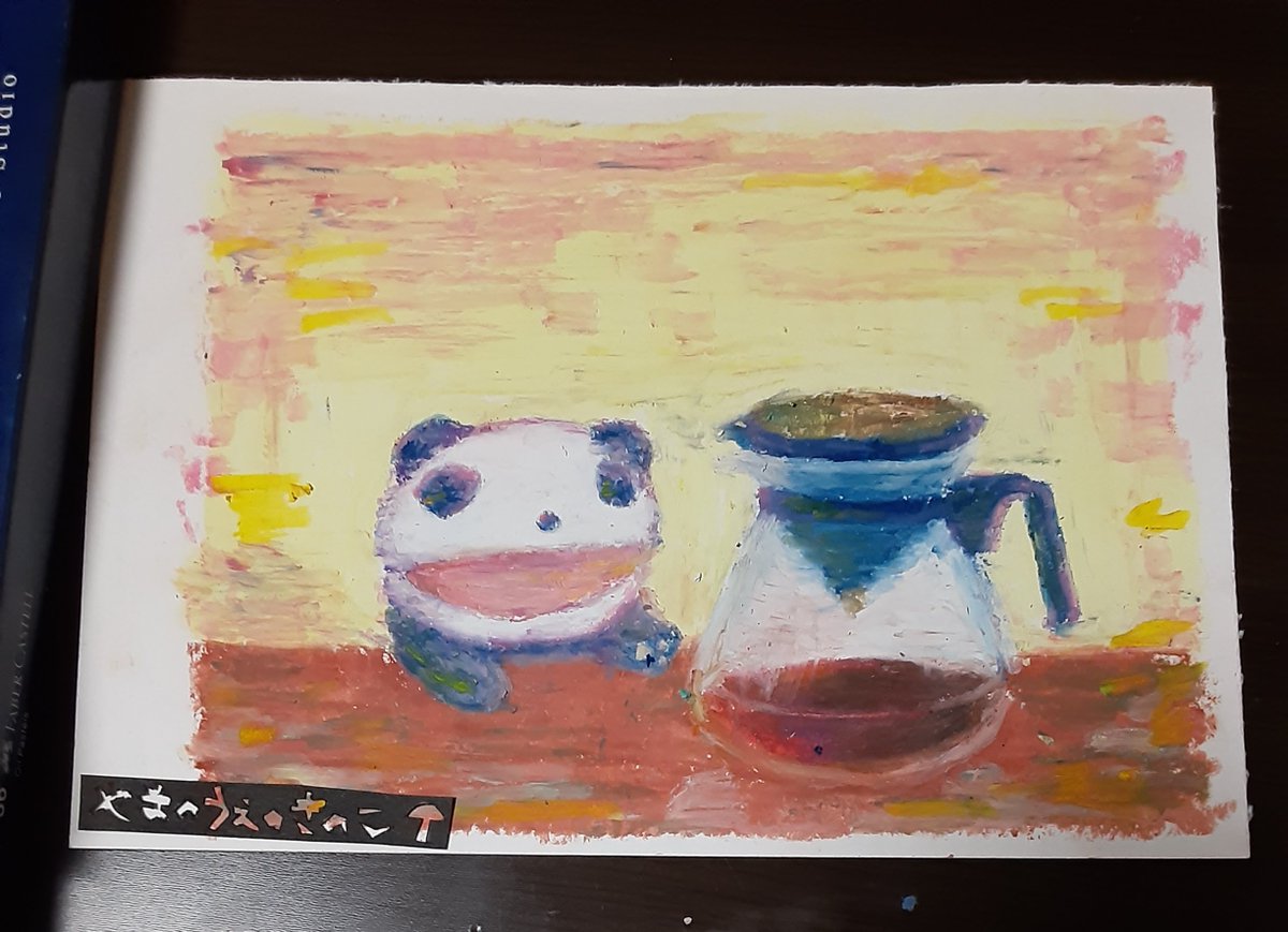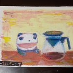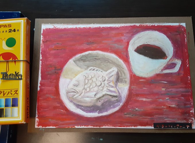 今日の絵。コーヒーとたい焼きアイス。 久しぶりのパステル画です。形が歪んでいるけど気にしない(^ー^)たい焼きアイスがどうしても食べたくて買っちゃいました。 #パステル画 #オイルパステル #絵描きさんと繋がりたい