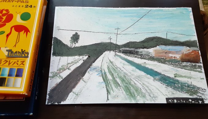 今日の絵。雪の降った朝。 夜に降った雪が、朝の光に照らされていました。雪の降る地域で育ったので、雪が降ると落ち着きます(^ー^) #絵 #イラスト #風景画 #絵描きさんと繋がたい #イラスト好きさんと繋がりたい #クレパス #オイルパステル