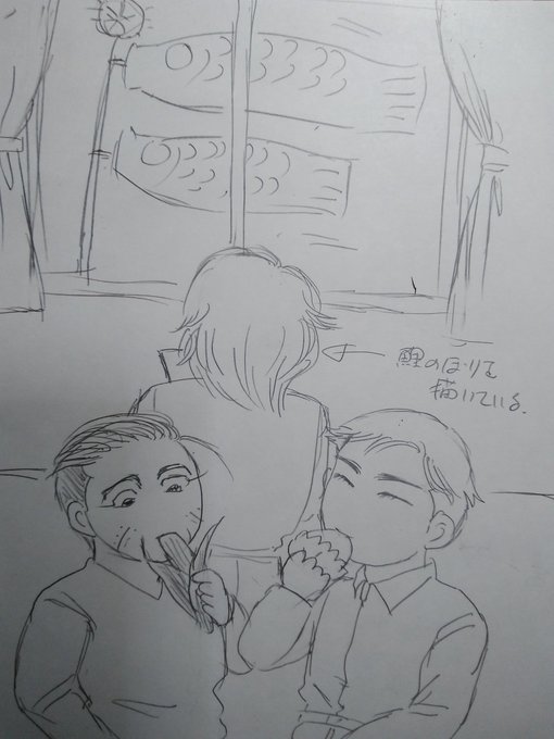 0 7 #ゴールデンカムイ版深夜の真剣お絵描き60分一本勝負 お題【こどもの日】 こどもの日に柏餅と粽を食べる尾形と勇作さん、鯉のぼりをスケッチするヴァシリ(色塗りまでやると時間がオーバーするので線画です) 23/05/05 23:15
