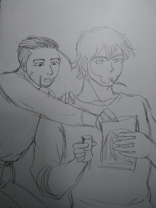 0 5 30分ドロ テレビを見ながらイカ下足のスルメを食べるヴァシリとそれに手を伸ばす尾形 #金カムアナログイラスト部 23/05/03 21:01