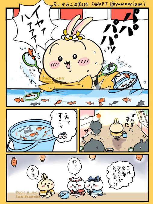 302 2659 縁日の法被がかわいくて・・・ バケツ持参で金魚すくいするうさぎ。めちゃくちゃすくいそう。ちいハチちゃんに見せるまでがセット。 #fanart #ファンアート 23/06/25 09:59