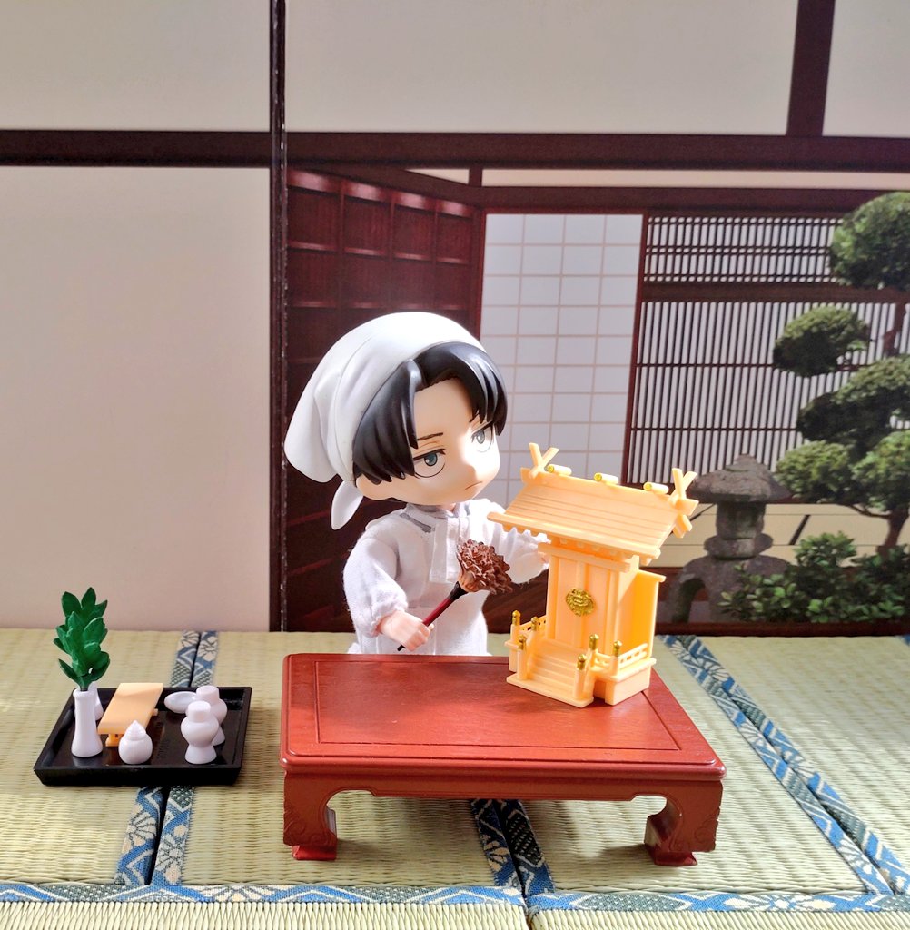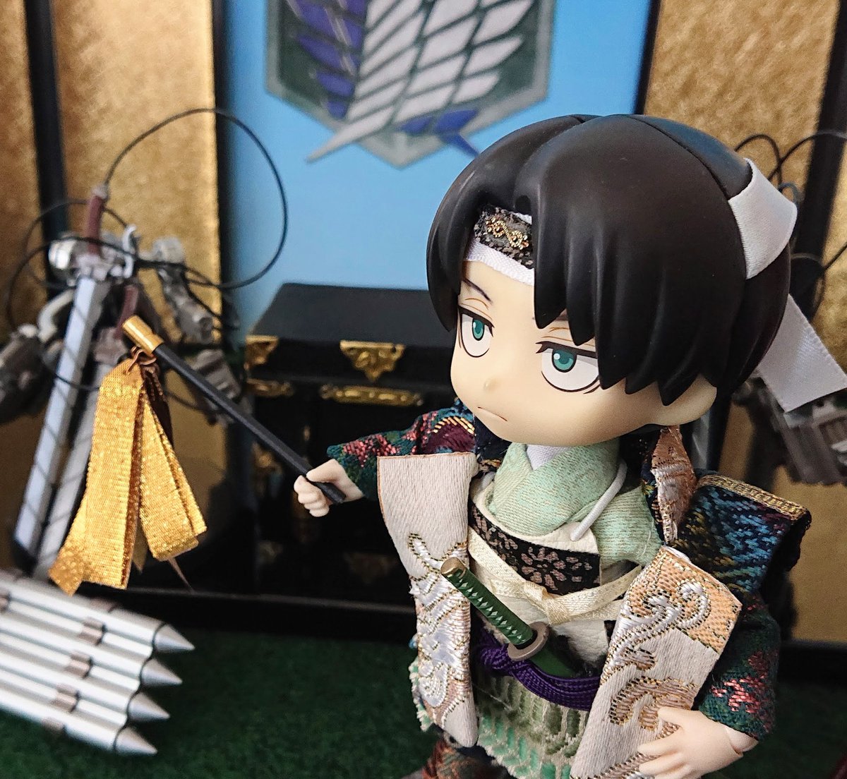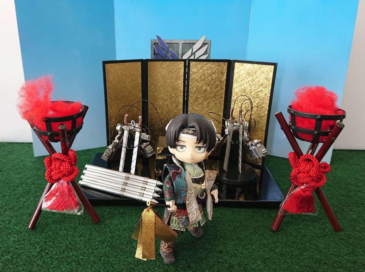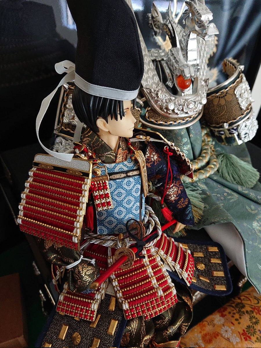 🎏端午の節句 今年は武具飾りが増えた武者兵長 総大将の貫禄だけど采配だけは金のハタキに見えてしまうキュートさ健在です😍 RAH兵長はゲームの甲冑ないから毎年同じので頑張っていただきます😄