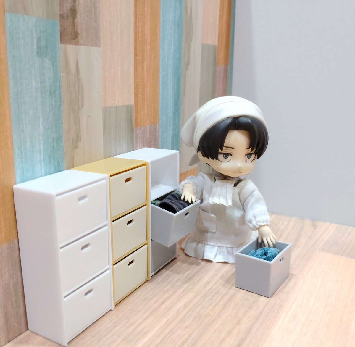 山田科学さんのミニチュアへの進撃が止まらないこの頃、いつものように利益が心配になるお値段以上のクオリティで販売されている3段カラーボックスをゲットしました😍 おかげでオカン兵長の整理整頓もはかどります。 1/12スケールがどんどん増えていくの本当にありがたいです✨🙏🙏🙏