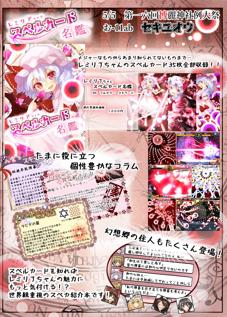 例大祭実はサークル参加します! 忙しくてしばはく休止してたので新刊はないですが、既刊もってきます! レミフラトランプ合同とレミちゃんのスペカ名鑑がメイン よろしくねー!!!