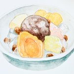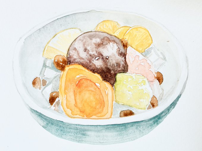 0 18 昨日の配信中に描きました あんみつと鯛の塩焼きです。 #水彩イラスト 23/07/04 18:52