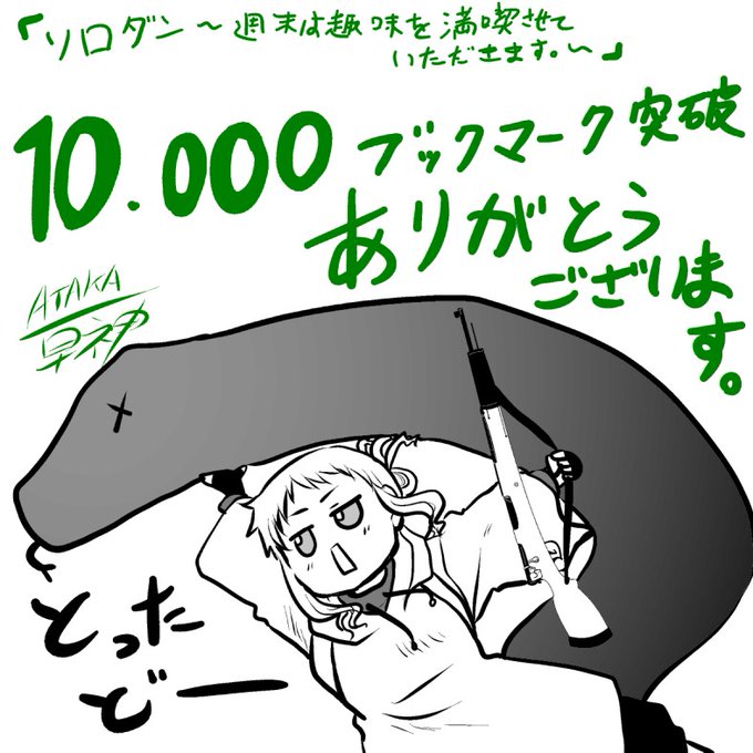 ソロダン再掲でした。面白かったらいいねやRTをよろしくお願いします。 Pixivブックマークはもうすぐ2万に届きそうです!! pixiv.net/artworks/98237… (画像は1万の時のお礼絵です。)