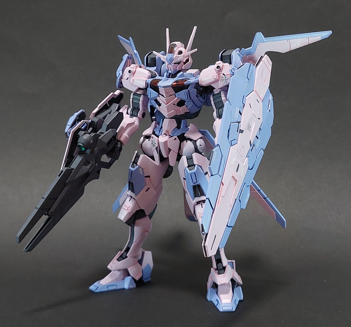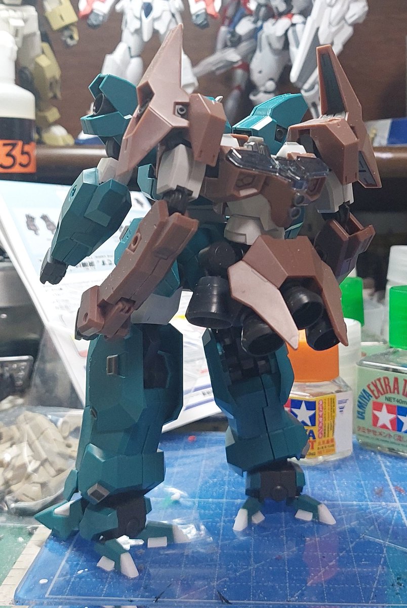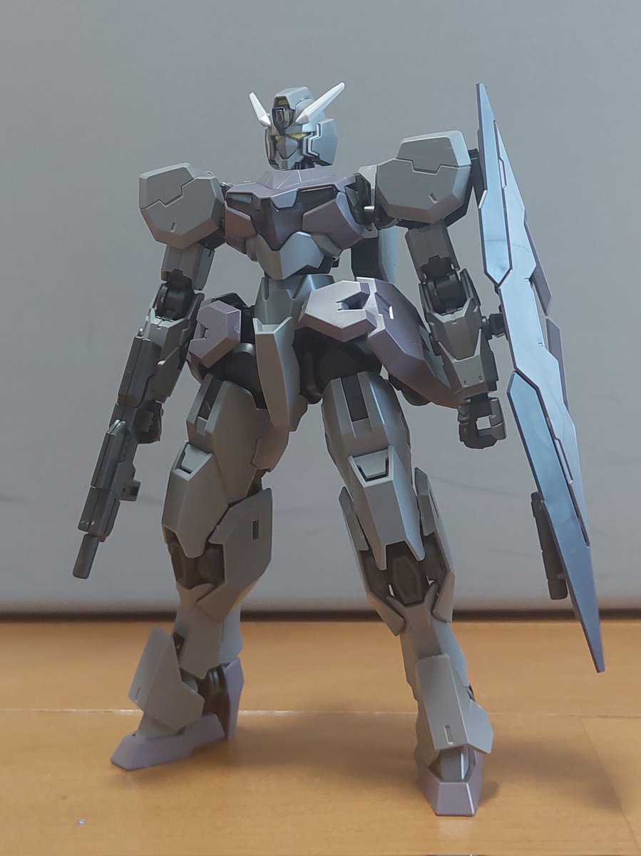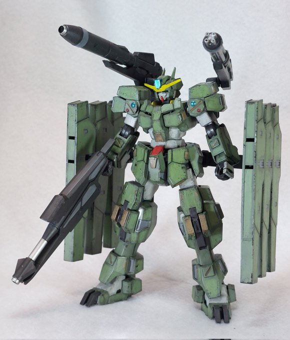 昨日のサバーニャに陸自茶色とニュートラルグレーで差し色追加。 武器にも差し色を塗ったらウェザリングです。 #ガンプラ #ガンダムサバーニャ