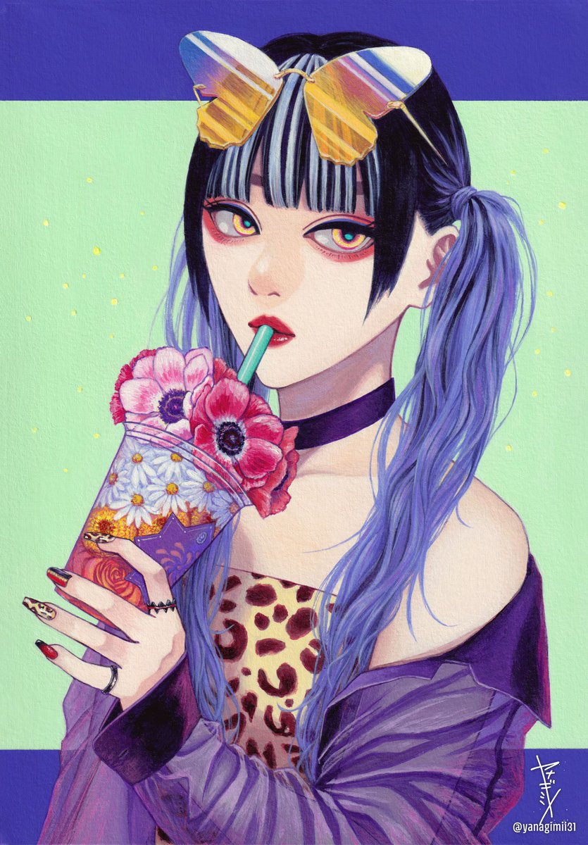 #今年も残りわずかなので今年一番伸びた絵を貼る 花の蜜を吸う蝶のように軽やかに可愛くカロリーを吸っていこうぜ!!!という絵です 1枚目はミヤマカラスアゲハ、2枚目はツマグロヒョウモンをイメージした子を描いております