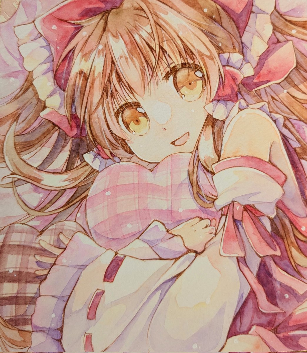 チョコではなくハートクッションと自身を差し出s…()霊夢さん。 バレンタインに間に合った…! #アナログイラスト #透明水彩