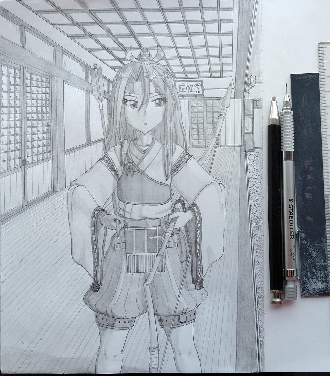 〜屋根の艦娘落書き〜 ☆千射万翦 ー 夏のある日、泊地の日本の空母艦娘が使っている弓道場に響く弓を射る音。 そこに佇んでいるのは、普段見せない瑞鳳の姿だった ー 可愛い『食べりゅ?』のずほチャンは他の方に任せて(笑) こういう瑞鳳ちゃんを描きたかった。 #艦これ #瑞鳳 #アナログ絵