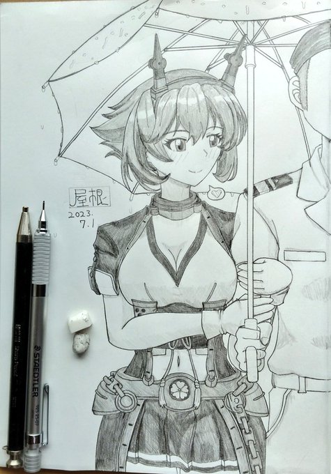 8 51 〜屋根の艦娘落書き〜 ☆提督さん、もし宜しければ由良の傘に入って行きますか? 梅雨ですし? 通り雨もありますし? たまに荒ぶる令和チャンですし? 可愛い娘に傘に入れて貰いてぇって妄想だけで描きました(笑) …1本だけと言うのがミソなのよ…( -`ω-)✧ #艦これ #由良 #アナログ絵 23/06/29 00:28