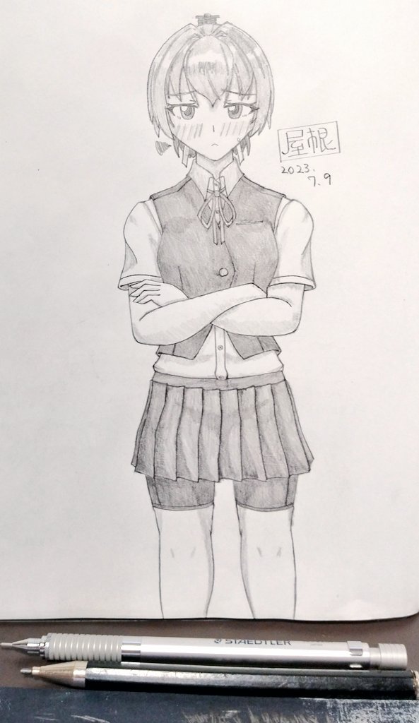 3 29 〜屋根の艦娘落書き〜 ☆何かに困ってる比叡 比叡「ん"ぅ〜…」 …って比叡チャンが何に困ってる時をイメージしました。 …何に困っているかはご想像にお任せします(笑) こういう明朗で活発なショートヘアの娘も良いですね♪ 実に捗ります♪( *´ω`* ) #艦これ #比叡 #アナログ絵 23/05/13 00:01