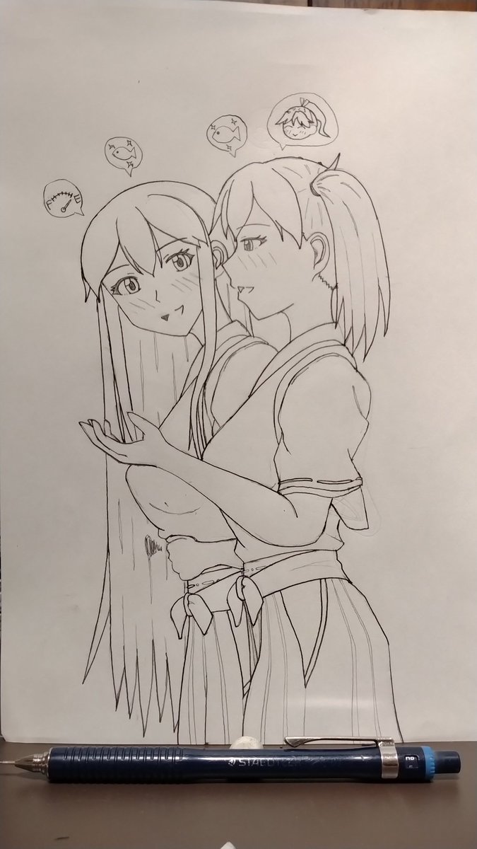 30 103 〜屋根の艦娘落書き〜 ☆扶桑姉妹と夏の浜辺 #扶桑 「…あら…提督、ご機嫌よう…もし宜しければ御一緒しませんか?///…山城…いいわね?」 #山城 「お、お姉様?!…お姉様からの申し出なら…はぁ…仕方ありませんね…///」 そんな浜辺でのやり取りをイメージしました♪ #艦これ #アナログ絵 23/07/22 14:08