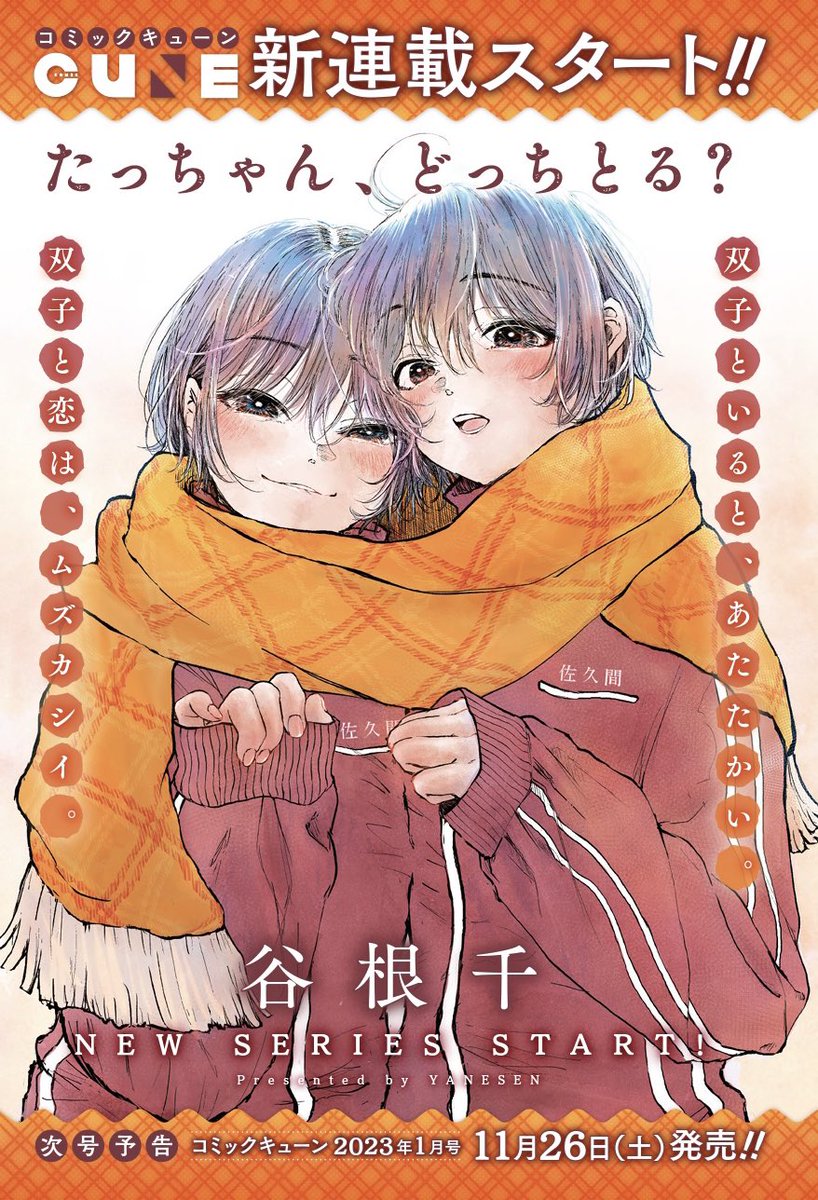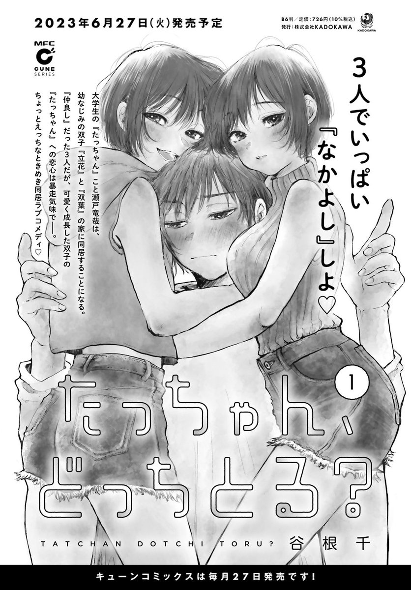 現在発売中の月刊コミックキューン1月号に「たっちゃん、どっちとる?」1話を掲載して頂いてます。 双子の男女に迫られてドキドキしちゃう大学生男のコのお話です。 よろしくお願いします♨️ comiccune.jp/magazine/new.h…
