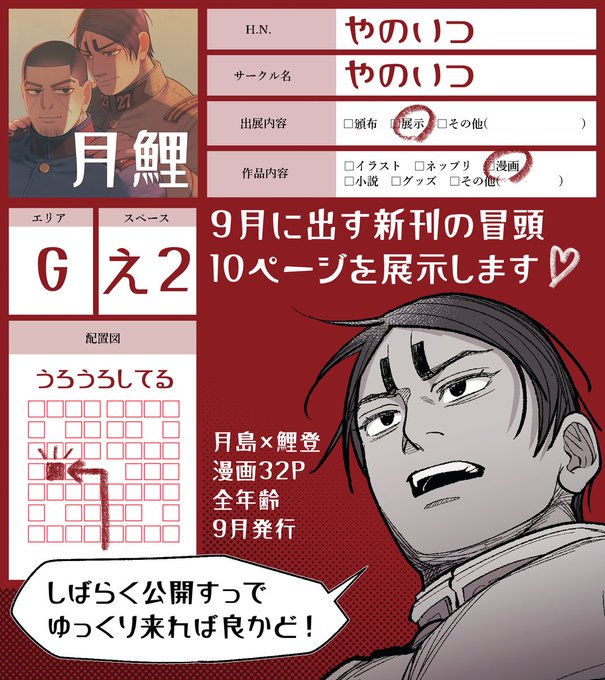 9月に出す月鯉本の冒頭10ページを展示しまーす!賊軍として軍法会議にかけられるところから始まる、二人のその後のお話です。ピクスクのサークルスペースから展示物に飛べるようにします。楽しみィィィ #koioto0806
