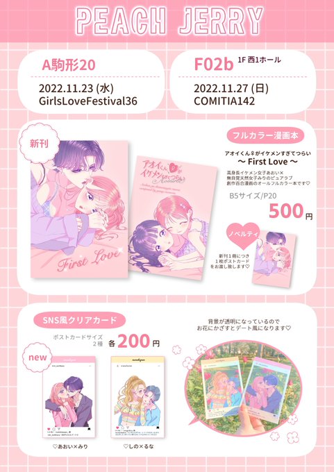 ♥11/23(水祝)Girls Love Festival36 ∟ 【A駒形20】 ♥11/27(日)COMITIA142 ∟ 【 1F西1ホール F02b 】 イベント初参加です…! 無配ペーパーや名刺もございますので お気軽に遊びに来て頂けたら嬉しいです♡ #GLFes #COMITIA142 #創作百合