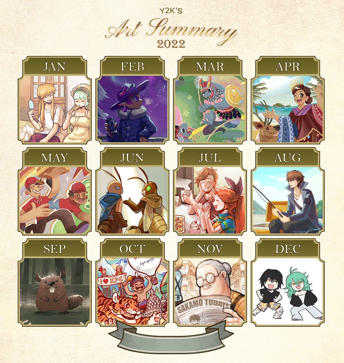 #Artsummary2022 !! My art resolution this year was to draw at least one full piece per month and i almost managed that! Almost... i always lose steam in december 🫠 I'm hoping to get more practice regarding anatomy and composition this year ^v^ thanks for sticking around!