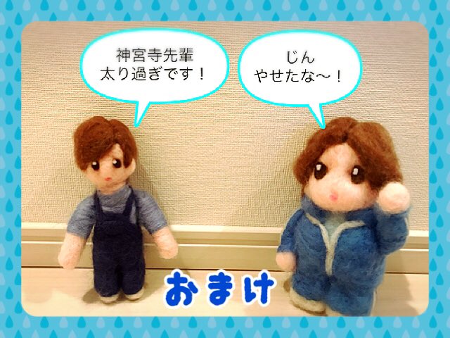 0 49 前から作りたかった、じぐいわの羊毛やっと完成💙💗 お洋服迷いましたが、これにしました! 密かにファンが多い、吹き出しシリーズ付き💙💗💙💗 羊毛1代目のジャージの神宮寺先輩も友情出演💙💙 羊毛フェルト、私には難しい😅 次はアイロンビーズします🤗 #神宮寺勇太 #岩橋玄樹 #羊毛フェルト 20/06/18 18:34