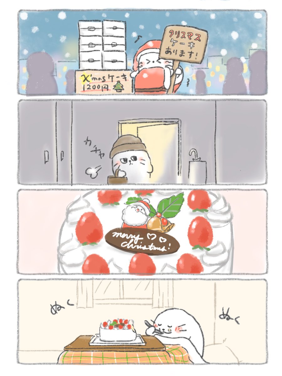 クリスマスイヴにバイトを頑張ったアザラシ、ちょっと贅沢をする🍰🎄 #MerryChristmas #イラスト #4コマ漫画 #illustration #絵描きさんと繋がりたい #ゆるいイラスト #イラスト好きな人とつながりたい #漫画が読めるハッシュタグ #manga #日常漫画