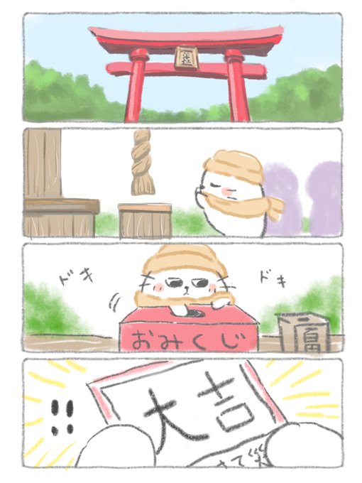 初詣で大吉を引いたアザラシ🦭⛩ #イラスト #イラスト好きな人と繋がりたい #絵柄好みって人にフォローされたい #絵描きさんと繋がりたい #漫画が読めるハッシュタグ #4コマ #漫画 #日常漫画 あけましておめでとうございます。今年もよろしくお願いします🤲