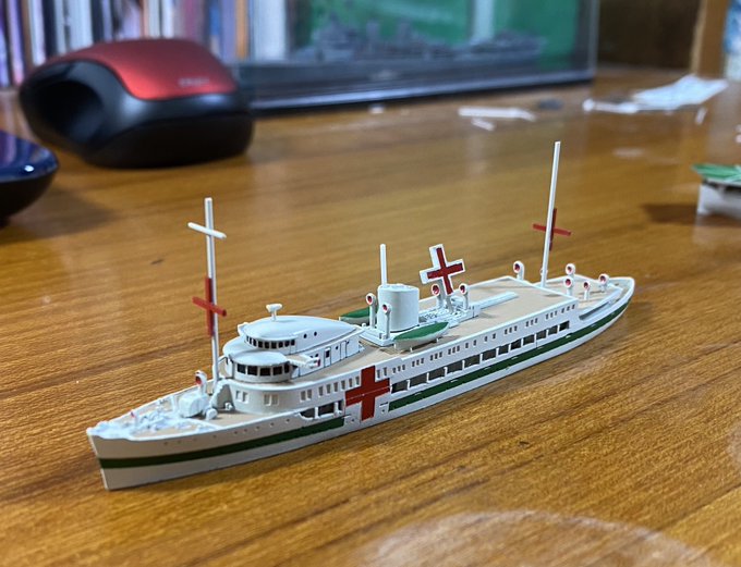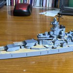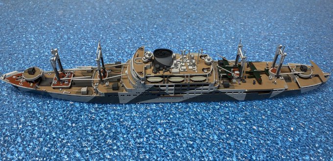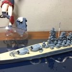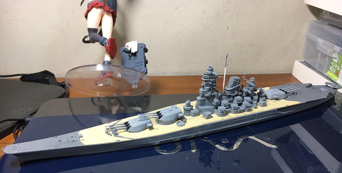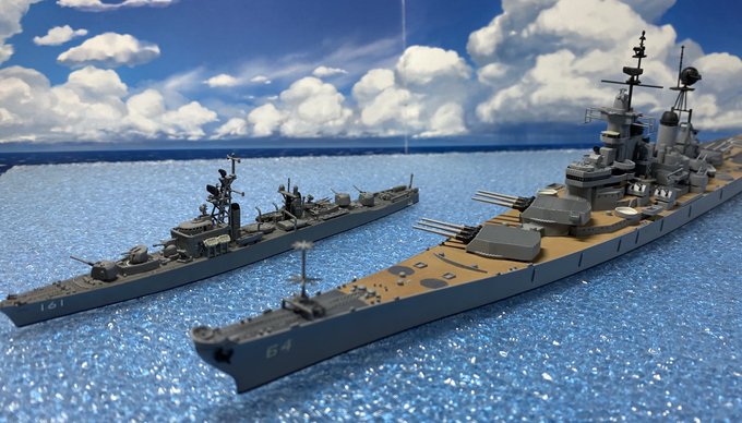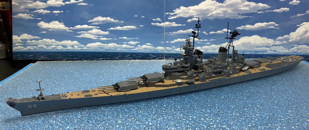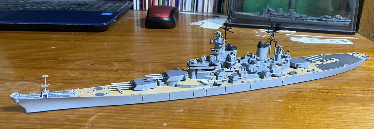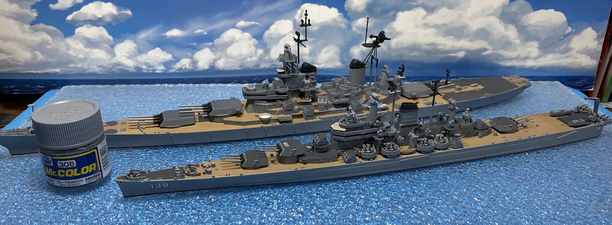 戦艦ウィスコンシン(ヴェトナムver) WW2戦後艦の塗装は困ったらクレオス306。船体塗装とレーダー類は上手くいったので、あとは艦番号とか着艦標識をどうするかですなあ。 #今月完成しなかったプラモ晒そうぜ