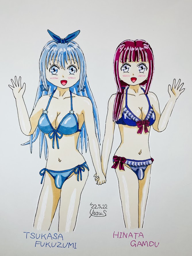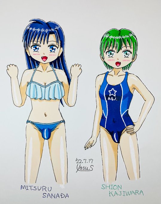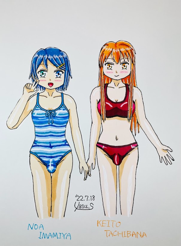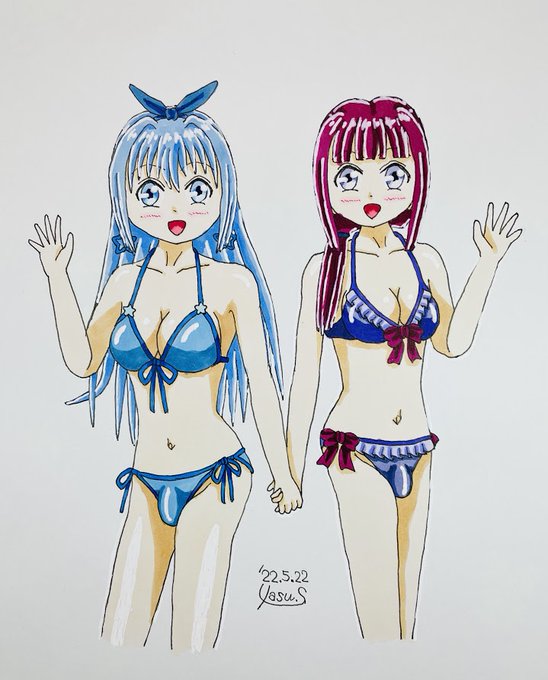 【もう1枚イラスト】この土日、そして今日とめっちゃ暑かったからなー。うちの男の娘たちの水着イラストを描いていたのもそれがあったからw…そしてもう1枚、AdAからつかさ、PdEからひなたのそれも描いてたよ♪この2人はビキニでw #今月描いた絵を晒そう #男の娘 #水着 twitter.com/yasu_75/status…