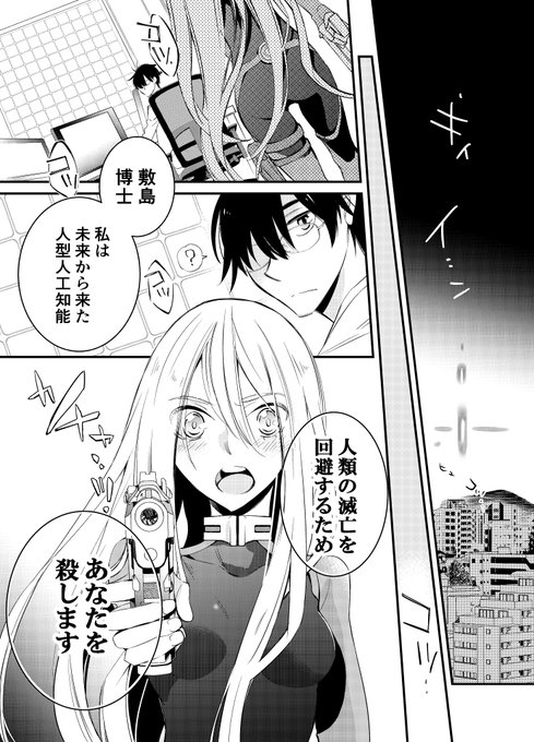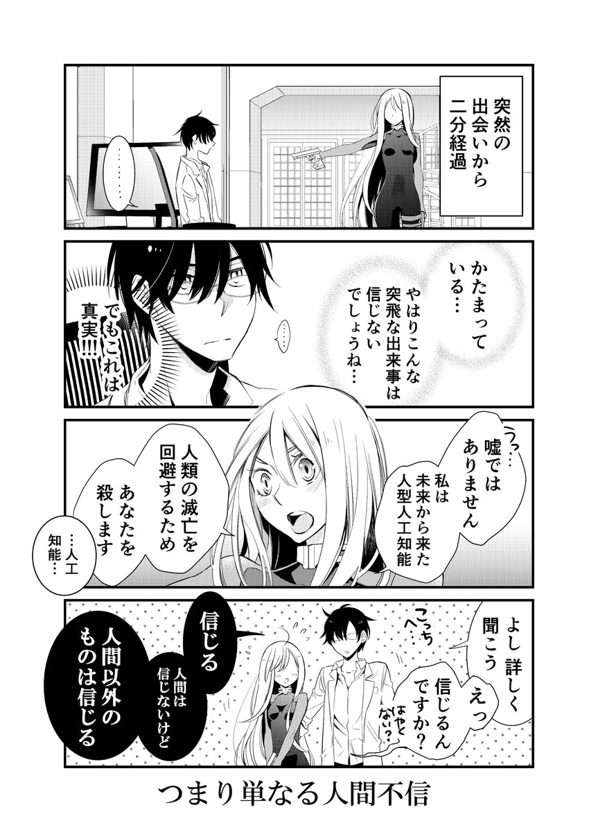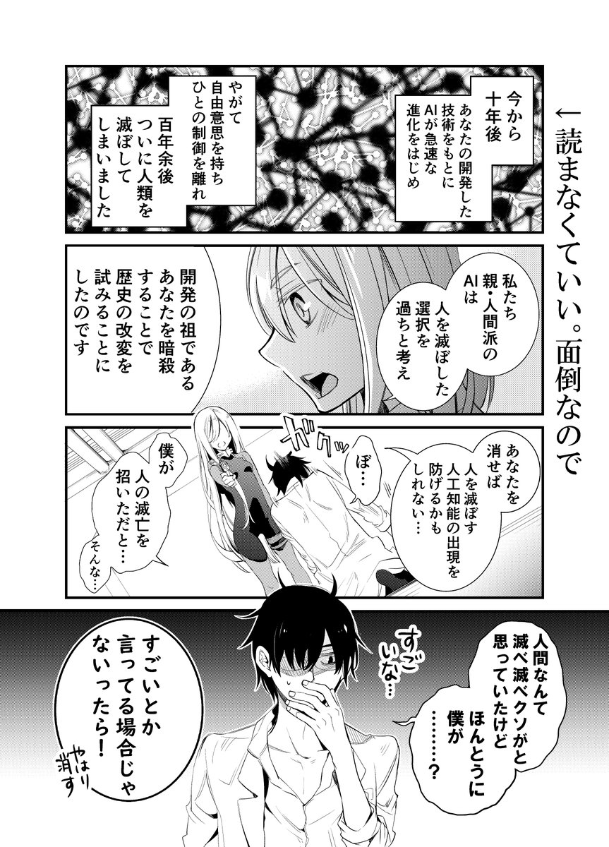 2019年発表 「終末博士とAIとアイ」 今朝突如短いのが描きたくなったので描こう!と思ってますが元々こんなネタでした。 博士のはだけた胸元とAIちゃんのピタピタスーツに全精力を傾けて描いた記憶がある…というかそれが描きたくて描いた記憶しかない。 #漫画が読めるハッシュタグ #漫画