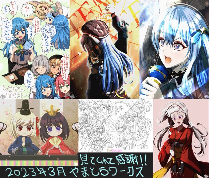 #今月描いた絵を晒そう 3月は6枚でした、すいちゃん多め ラフは2枚分なのでカラー1枚換算なりませんか、仕上がらなかったので5枚ですね 1カ月4枚に戻せそうなペース 来月も(今描いてる)ドンドン描きますよ ペース上げてけー