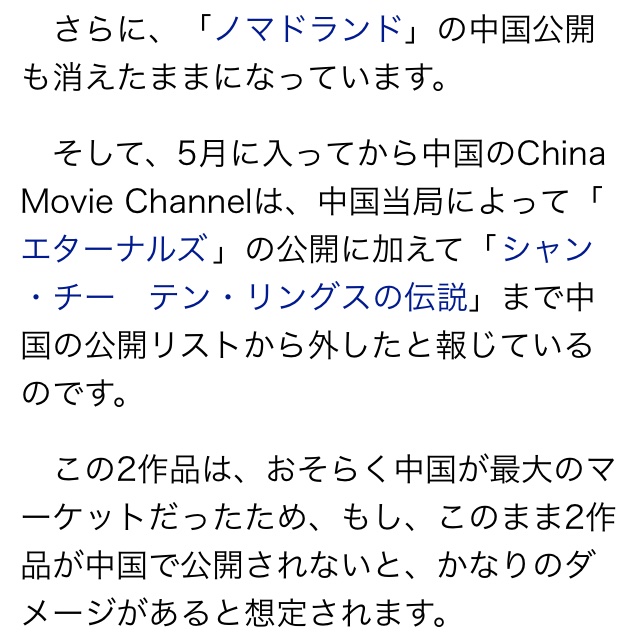 ムーラン騒動起きてた時にシャンチーもこの時勢だと炎上かなんかするんでしょうなって予想入ってたりしたけどそもそも公開NG判定でててしかもノマドランドから地続きで起きたこと絡みだからディズニーの中国市場路線って現時点でもうだめなんだな