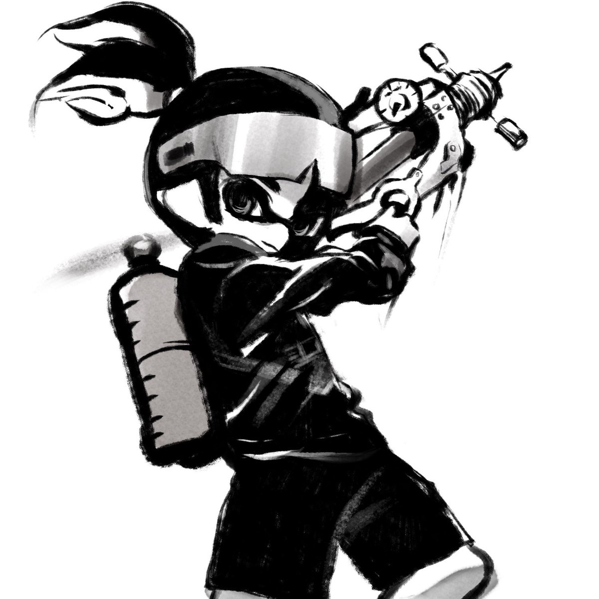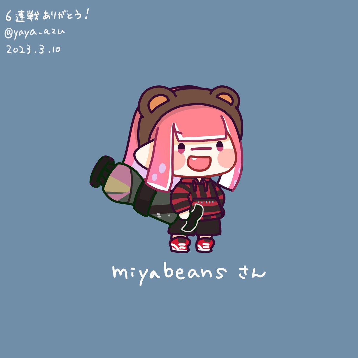 #バンカラチャレンジで5連続味方になった人を描く awonwonさん。周りをよく見てくれて、カバーが早くていつも私を助けてくれたしマッチメイク中に挨拶してくれたのも嬉しかった! 4連勝の後、通信エラーで解散になった時は叫んだ…5戦目は戦ってないけど残ってくれてたので描きました。 #Splatoon3
