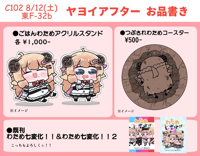 【告知】 C102にて頒布したわためグッズが、メロンブックスで予約開始いたしました~~!! 拡散よろしくお願いします🙏🙏🙏 ・わためアクスタ1 melonbooks.co.jp/detail/detail.… ・わためアクスタ2 melonbooks.co.jp/detail/detail.… ・つぶされわためコースター melonbooks.co.jp/detail/detail.…
