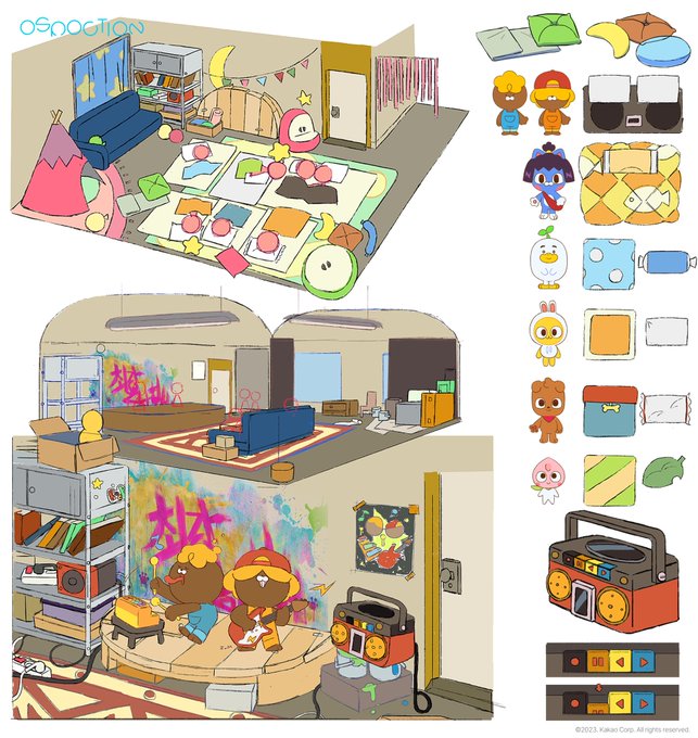 167 282 아트 디렉터로 참여한 #내마음은무지 속 작업한 배경 디자인. 무지집/네오네 아파트 순이다. 아이들이 보는 애니메이션인 만큼 다양한 양식의 주거공간을 고민했다. 네오집의 경우 연식이 오래된 아파트를 모델로, 프로도 집은 일층에 상가를 끼고있는 형태의 빌라를 모티브로 작업함 23/06/25 00:20