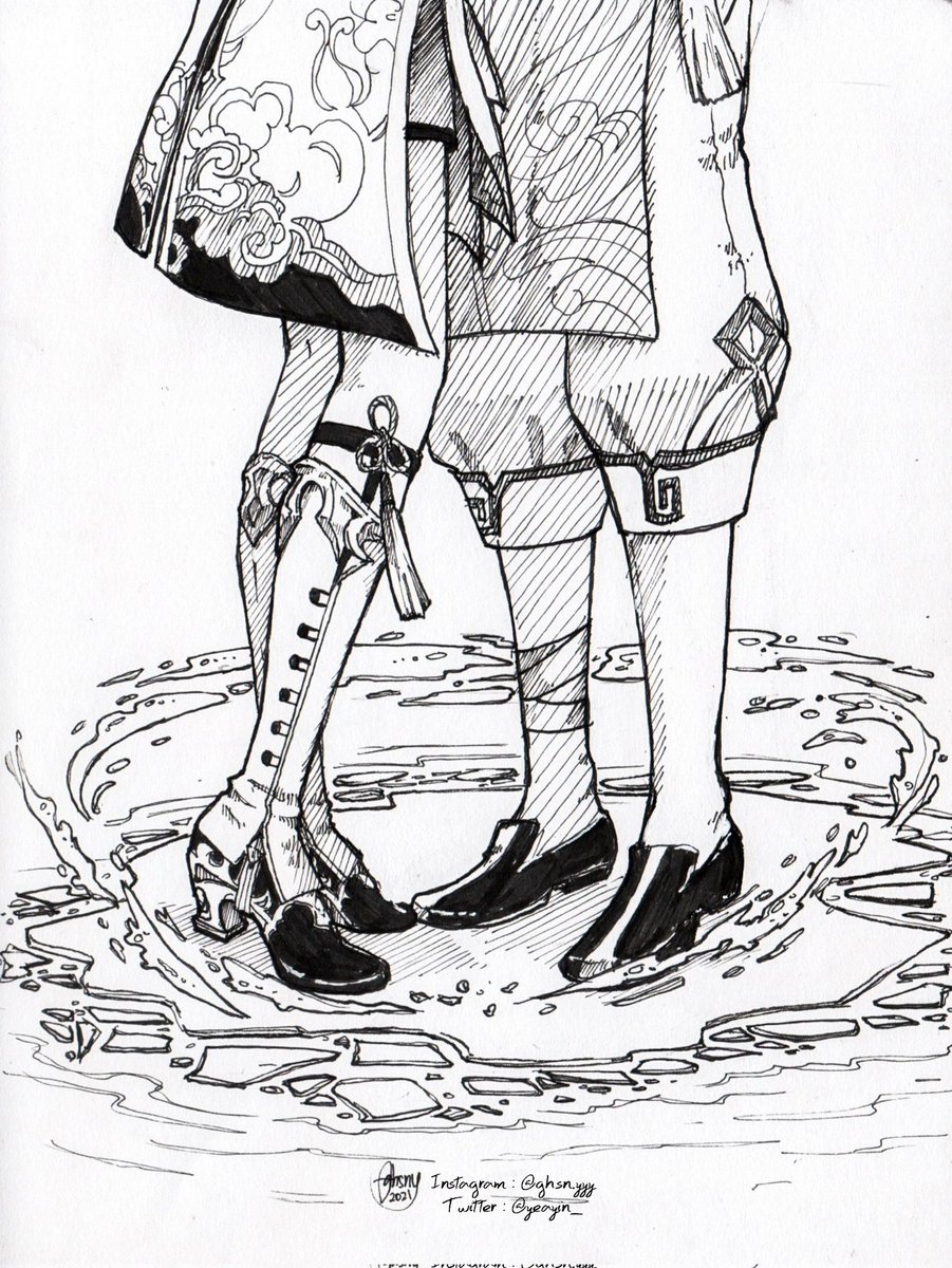 #inktober Day 2 - (The) couple of shoes Has been a while since I make traditional art. I dunno what they do, I just wanna draw shoes 😂 #inktober2021 #inktober2021day2 #Xingqiu #Chongyun #xingyun