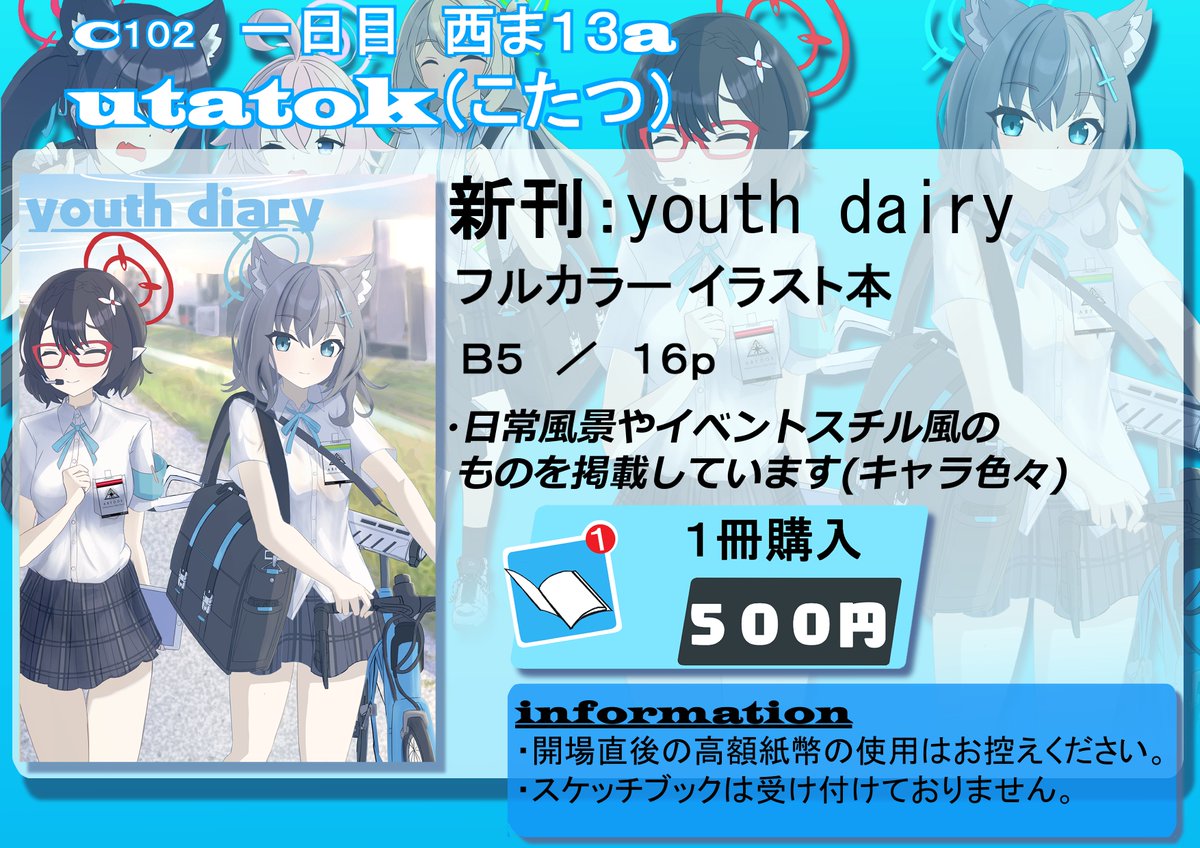 C102お品書きできました。 新刊はブルアカのフルカラーイラスト本16Pになります。 一日目(土) 西ま13aです。 よろしくお願いします。