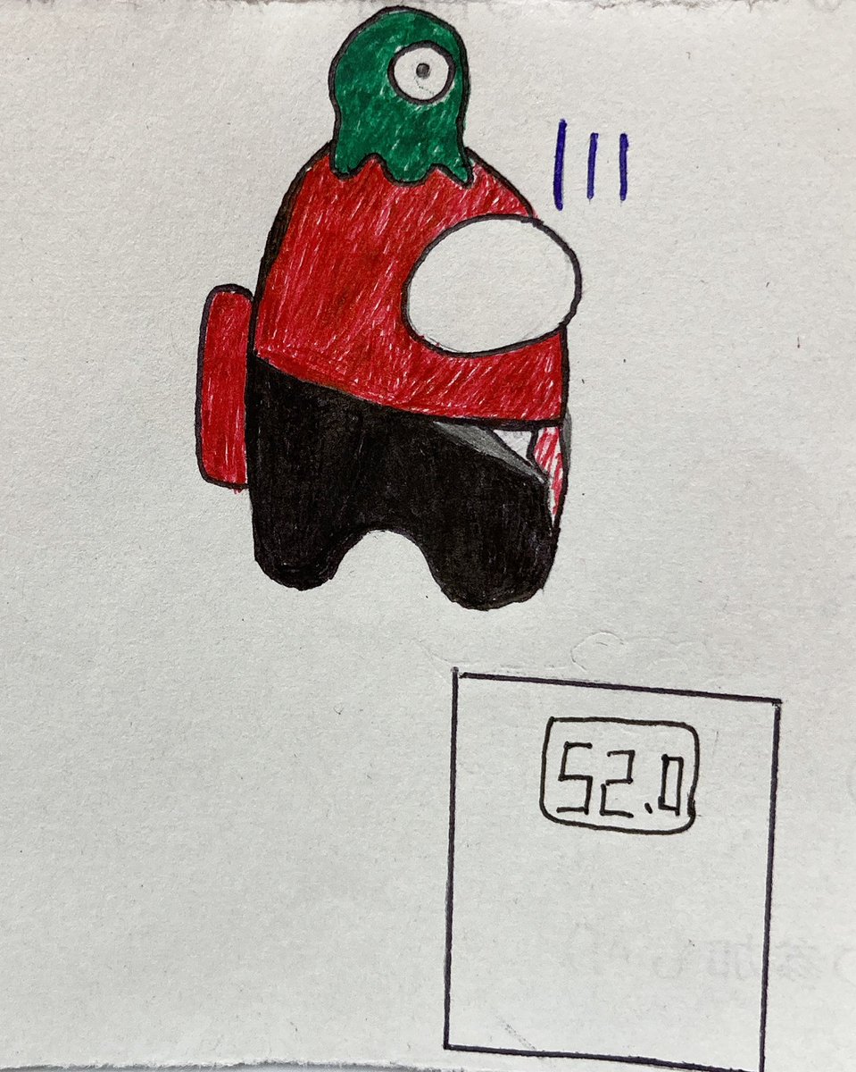 <5月22日AmongUs配信での出来事> 体重が52キロでショックを受けていた先端さんが可愛かった。 しかも179㎝って細すぎません? そんな様子をボールペンでかいてみました! #せんたんあーと #イラスト #AmongUs #AmongUsイラスト #絵描きさんと繋がりたい