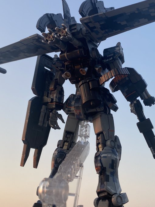 F-2戦闘機をイメージしつつ、フライトユニットはプラ板で自作 制作中マーヴェリック観ちゃったんで日の出をバックに屋外撮影♪ ↓画像続きます #ガンダムの日 #ガンプラはどんな自由な発想で作ってもいいんだ