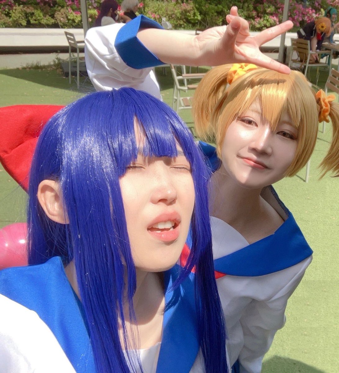 12 58 #倉コス3 #コスミート 1日目あっという間でした!! ステージも見るのも出るのもほんとに楽しかった🌟 無言フォロフォロバすみません🙇♀️ これは綺麗に影がハーフハーフなポプ子と眩しそうなピピ美です💙💛 明日は姫アキでうろついてます!楽しみ👻🚬 23/05/04 20:31