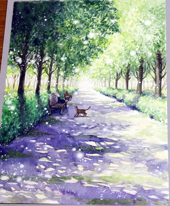「木漏れ日の煌き」というB5サイズの作品です。 少し前に描きました。 ここ数日晴れの日が続いて嬉しいですが、暑い💦 よくないかなと思いつつ、アイスとか冷たいものばかり食べてます🍦 #絵描きさんと繋がりたい #絵描き人 #絵