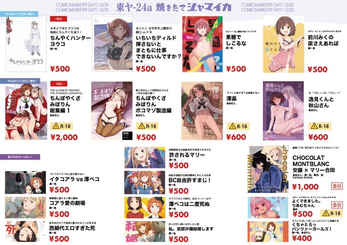 C99 1日目東ヤ24a「焼きたてジャマイカ」のお品書きです 品数満載につきお品書きで「新刊をでっかく目立たせる」のを諦めました! さあ目を皿のようにして頒布物の全てをお探しください!! 当日はポスターを目標にGO、または委託↓でよろしく! melonbooks.co.jp/circle/index.p… ec.toranoana.jp/tora_r/ec/cot/…