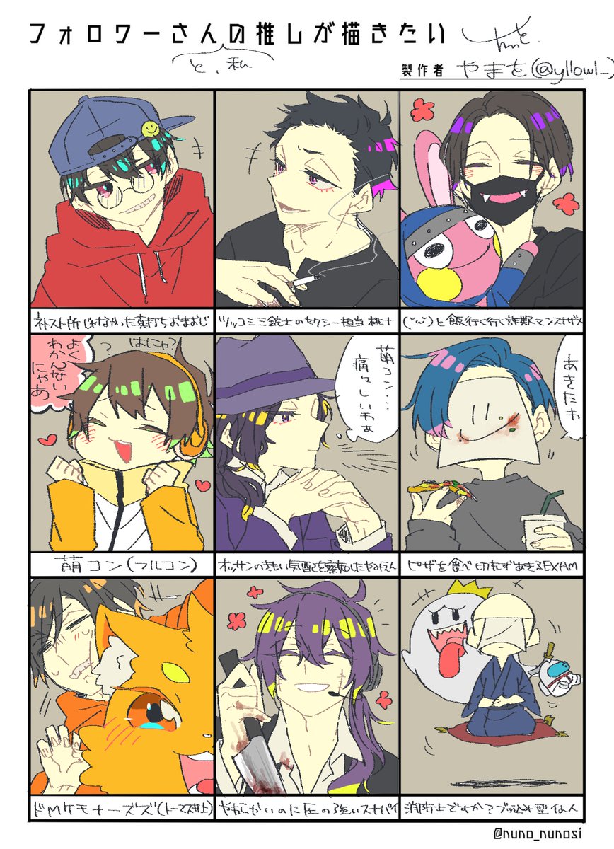 8 39 #フォロワーさんの推しが描きたい 上三人がお名前頂いた方たちで残りの六人はわたしの推しですよろしくおねがいします 楽しかったです!!!!リプくださった皆さんありがとうございました〜〜〜〜!!!🙌 22/01/19 18:53