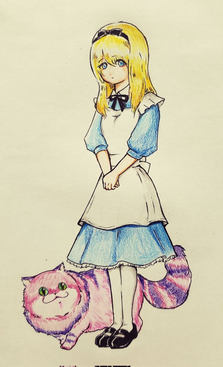 #不思議の国のアリス #アリス #チェシャ猫 #創作 #イラスト #アナログ #色鉛筆イラスト 描いたけど上げうか迷ったアリスちゃん。