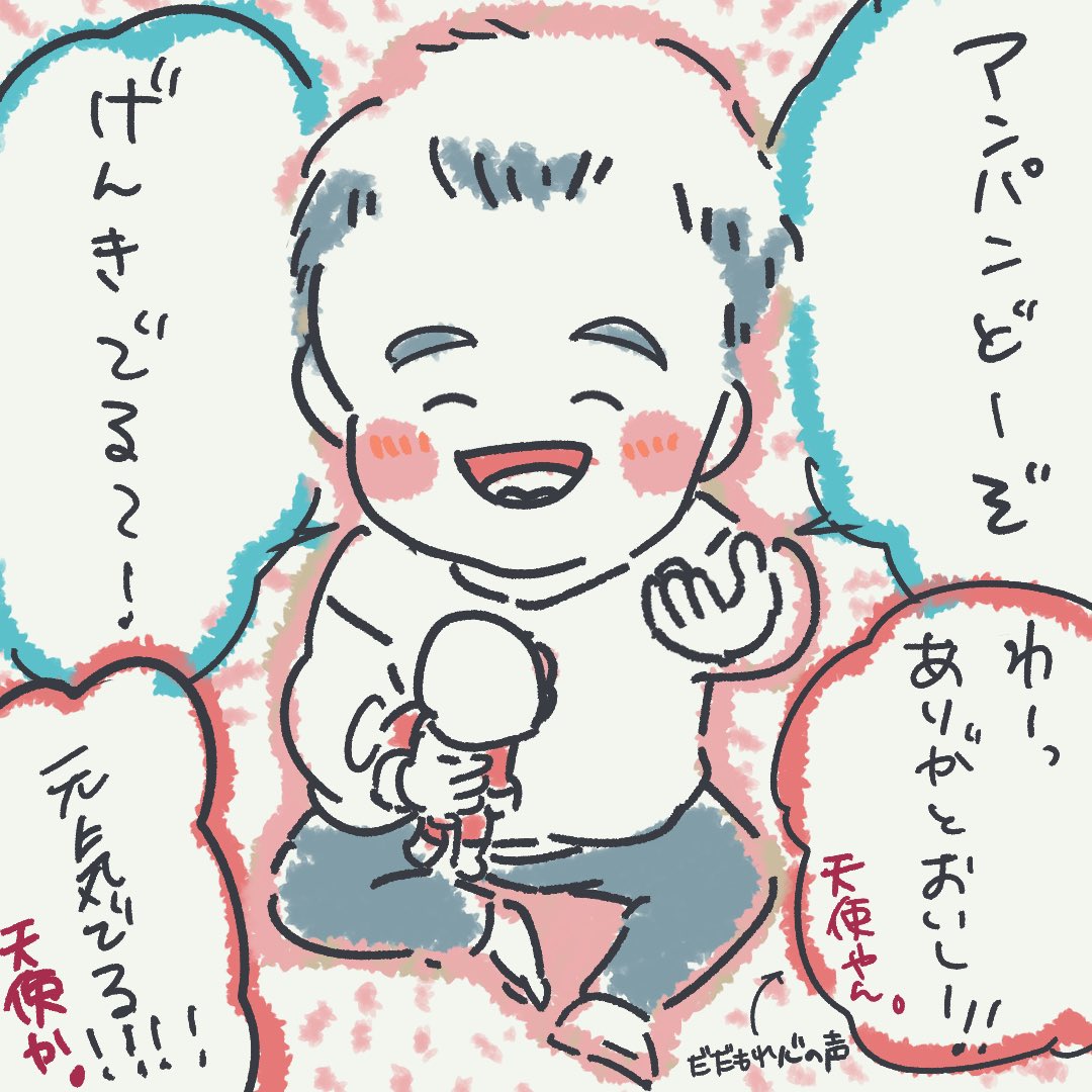 天才『クリームパンダチャンコーキテル!』 #育児絵日記 #あめこのきろく (1ヶ月後「ロールパンナちゃんRってかいてある!」とか言う天才)