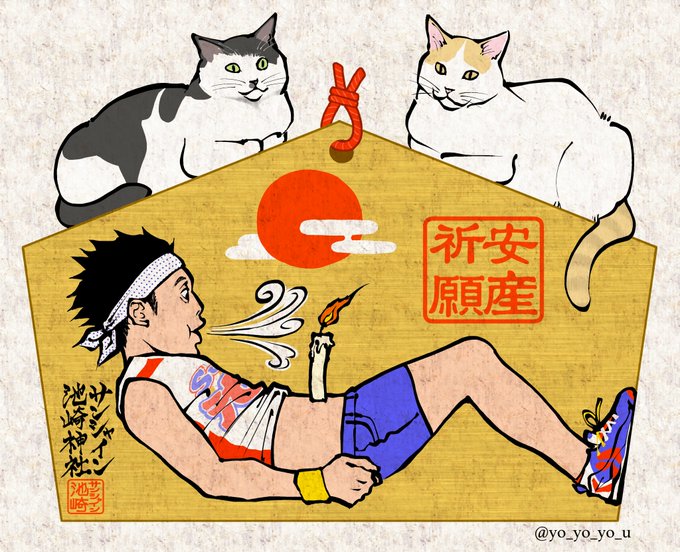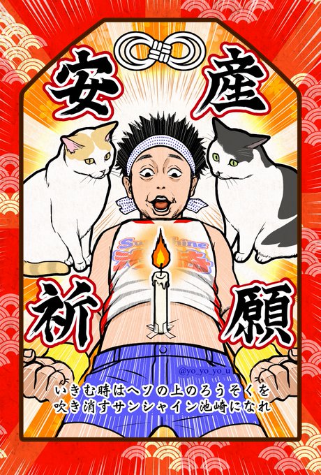 妊婦さん達の間で「いきむ時はヘソの上のロウソクを吹き消すサンシャイン池崎になれ」というコツが推奨されているそうです。 ので、安産祈願のイラストを描きました。これから出産を控えている方に送る等してお使い下さい。@ikezaki_YEAH twitter.com/ikezaki_YEAH/s…